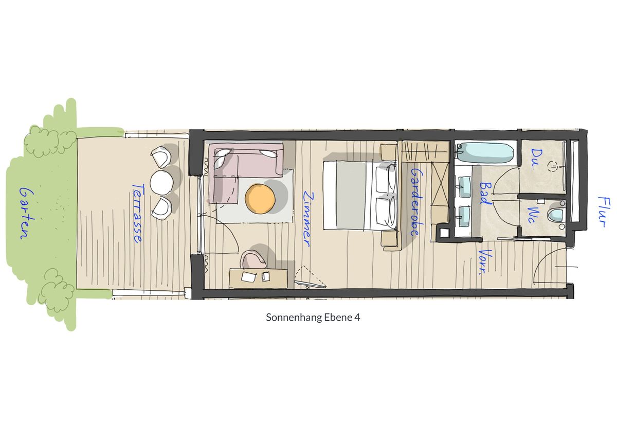 Die Zimmer sind 42m² groß und sind ausgestattet mit großem Bad mit Badewanne, Dusche, WC (auf Ebene 4 separat), Balkon (auf Ebene 5) bzw. Terrasse (auf Ebene 4), begehbarem Kleiderschrank, Safe, Telefon, WLAN, SuitePad, Kabel-TV, Minibar (für Sie inklusive), Wasserkocher für Tee- und Kaffeezubereitung, Klimaanlage und abgetrennter Sitzecke. Ein Zimmer auf Ebene 5 ist behindertengerecht ausgestattet, 4 Zimmer auf Ebene 5 sind barrierefrei.