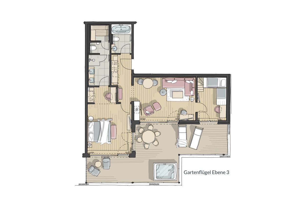 Die exklusive Familien-Suite mit modernster Technik und Ausstattung zum wohlfühlen im Gartenflügel.