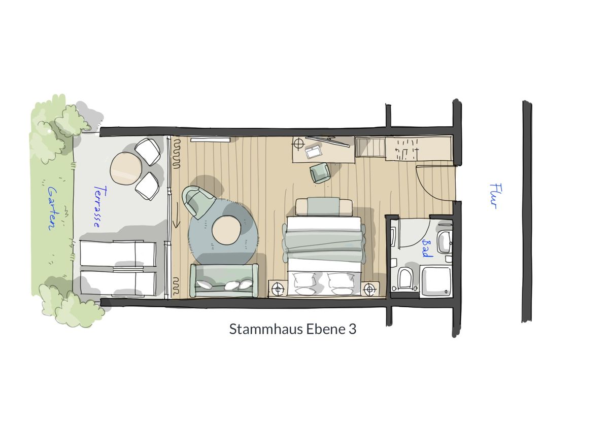Doppelzimmer mit Terrasse auf Ebene 3 im Stammhaus.